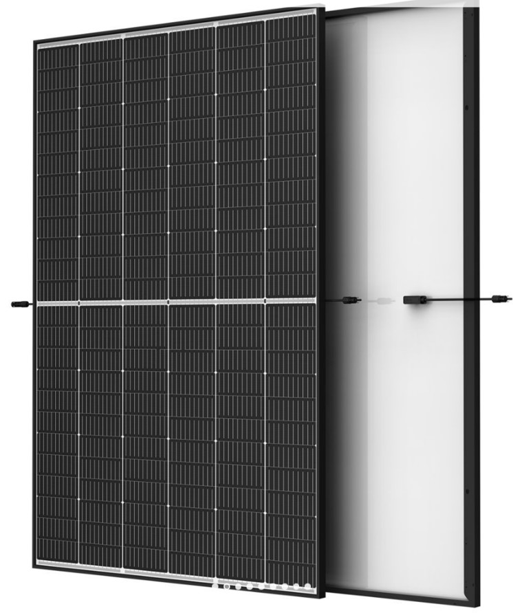 - Monokristalline Halbzellenmodule: Z.B. 200x Trina Vertex N Dual Glass MONO 500 W (TSM-500-NEG18R.28-MC4) mit schwarzem Rahmen (Maße: 1961 x 1134 x 30 mm)