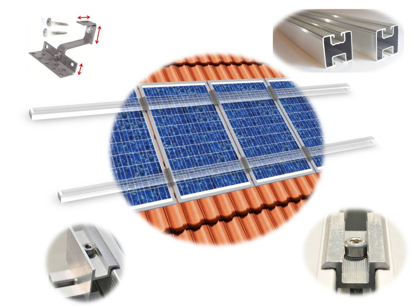 - Montagesystem: Einlagiges Montagegestell speziell für Ziegeldächer, angepasst an einen Sparrenabstand von ca. 85 cm. Einfache Montage der Module in Hochkant-Verlegung.