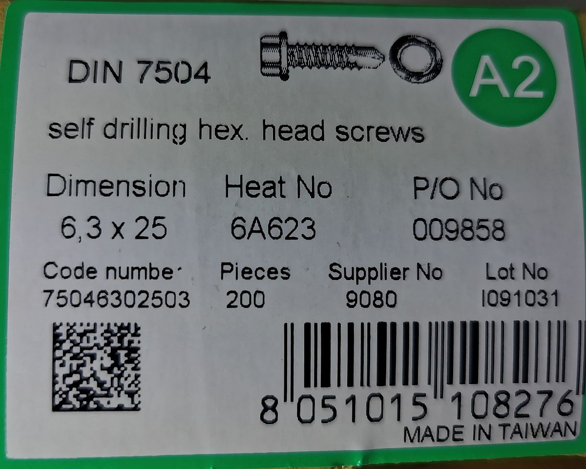 Werkstoff: Edelstahl A2 (1.4301) | Abmessung: 6,3 × 25 mm | Norm: DIN 7504-K (Sechskantkopf) | Spitze: Frässpitz, selbstschneidend