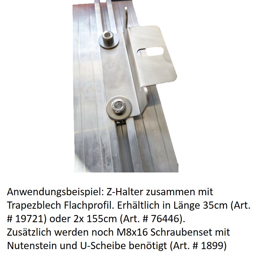 Oder in Ergänzung mit unserem flachen Trapezblechprofil (Art. # 19721 in 35cm oder Art. # 76446 in 2x 155cm für durchgehende Schiene) mit M8x16mm Innensechskantschrauben / Nutenstein (Art. # 1899). Beispielbild in der Fotogallerie.