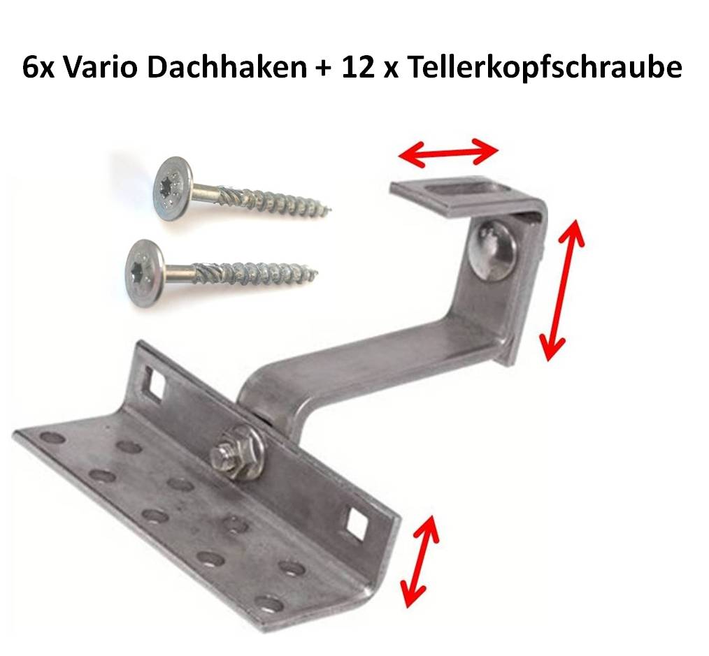 - Set für die Montage von zwei Modulen in hochkant nebeneinander auf Schrägdach (Ziegel, Dachpfannen). Set enthält alle notwendigen Komponenten wie Dachhaken, Aluprofile, Schrauben, Klemmen.