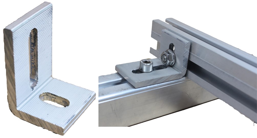 Der 90° Winkel dient als Verbinder von Aluminiumschienen. Zum Beispiel zum Aufbau eines Kreuverbund (zwei Lagen) für die Installation einer Photovoltaikanlage. Aber auch für viele andere Anwendungen für die Verbindung von Aluprofilen.