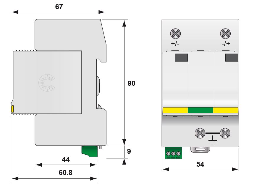 Der DS50PVS-1000G/12KT1 ist für PV-Netze mit Spannungen von max. 1060 Vdc geeignet. Er ist konform mit der europäischen Norm EN50539-11. Der DS50PVS-1000G/12KT1 ist ein zweiteiliger Kombi-Ableiter vom Typ 1+2 und für die Montage auf Hutschienen ausgelegt. Durch das steckbare Schutzmodul ist im Fehlerfall ein schneller Austausch gewährleistet.