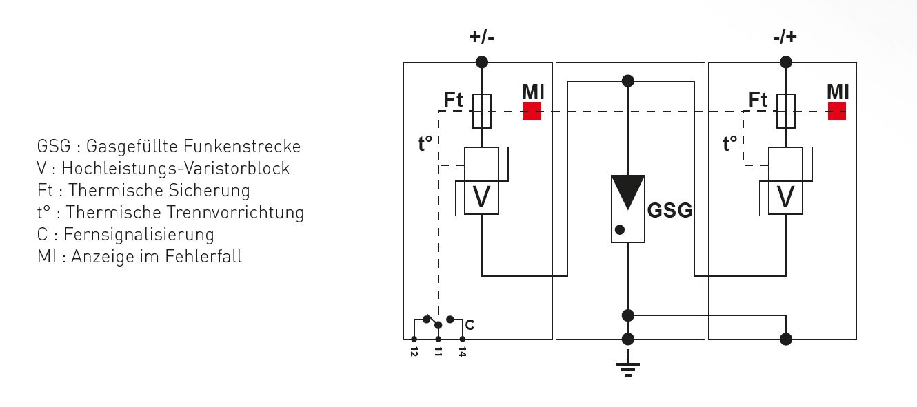 Die Schutzschaltung besteht aus einer fehlerresistenten Y-Schaltung mit Gasgefüllter Funkenstrecke und Hochleistungsvaristoren. Der DS50PVS ist standardmäßig mit Fernsignalisierung erhältlich.