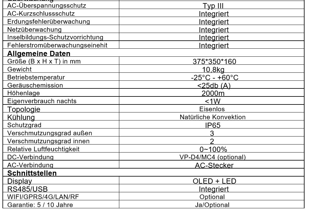 Ferner ist eine DC Lichtbogenerkennung integriert (AFCI). Diese erkennt Kurzschlüsse in der DC Leitung und schaltet das Gerät ab um einen Brand in der Gleichstromleitung zu verhindern. -