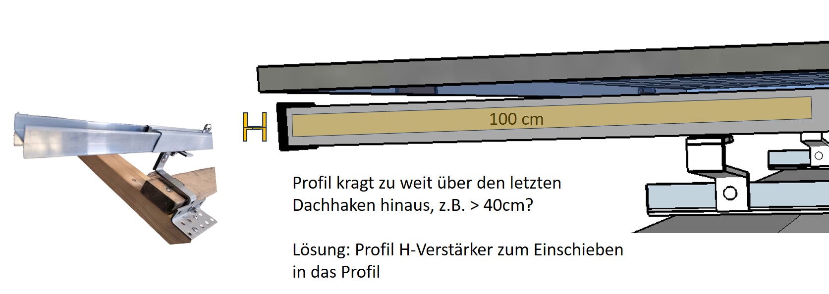 Bei starker Überkragung des Profils über den letzten Dachhaken empfehlen wir, in Kombination mit unserer Profilverstärkung einen Schwerlastdachhaken aus unserem Sortiment anstelle eines Standard-Dachhakens zu verwenden. Durch den langen Profilüberstand ist die Last auf den letzten Dachhaken sehr hoch, insbesondere in Kombination mit Wind- oder Schneelasten. - Verstärkung bei großem Biegemoment:
