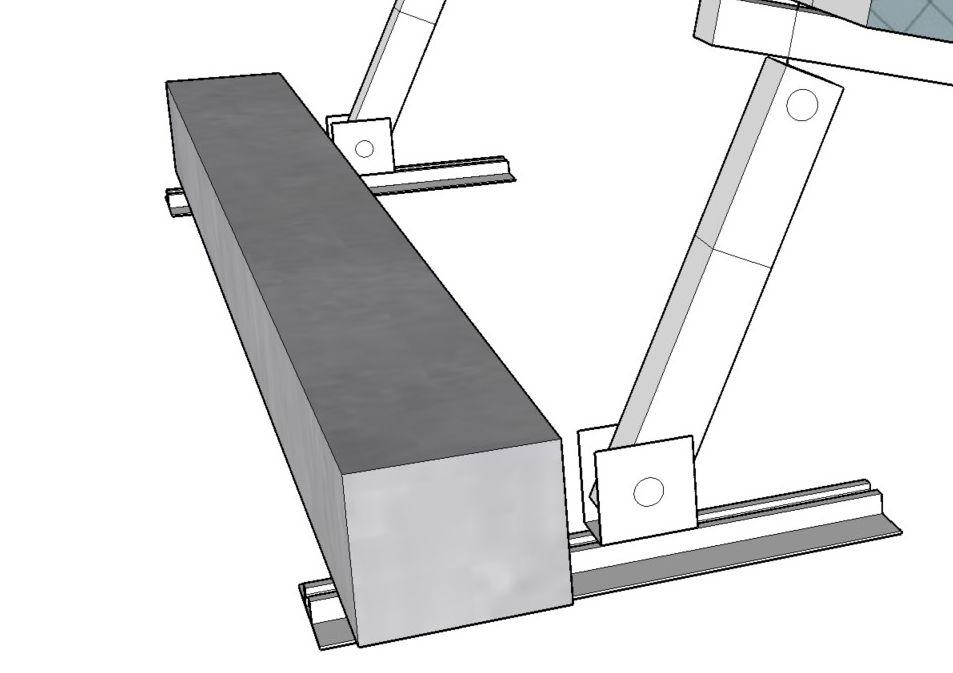Beschwerungselemente können auf dem Fußblech platziert werden. Als Beschwerung bieten sich beispielsweise Stahlbeton Türstürze an welche typischerweise für wenige Euro in Baumärkten mit Längen bis zu 1,5m angeboten werden. Dieses Betonelement kann quer oder längs über zwei Schienen übergreifen aufgelegt werden. Beachten Sie, dass das größere Gewicht auf der "höheren" Seite sein sollte, da hier vom Wind das größte Kippmoment erzeugt wird.
