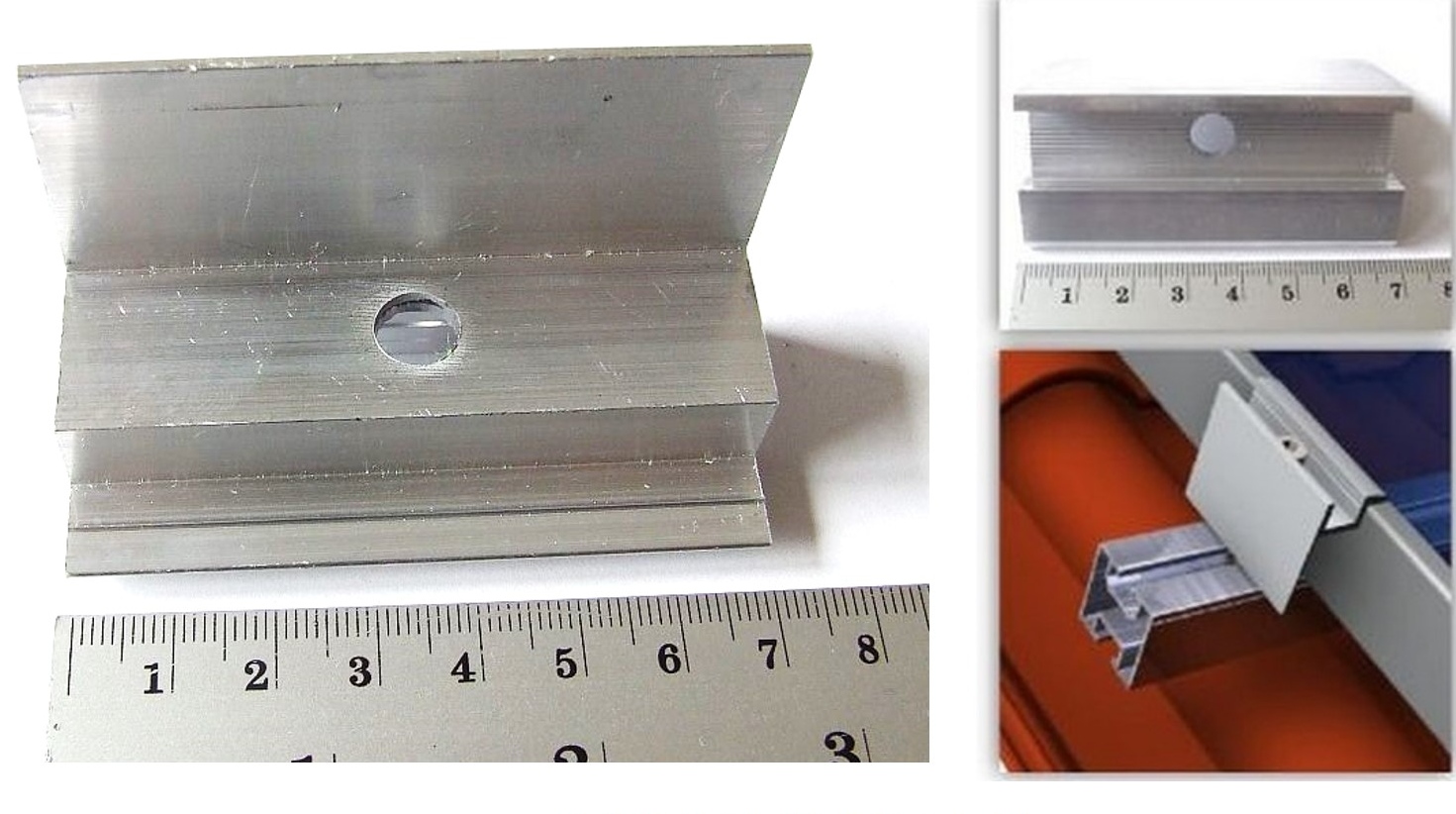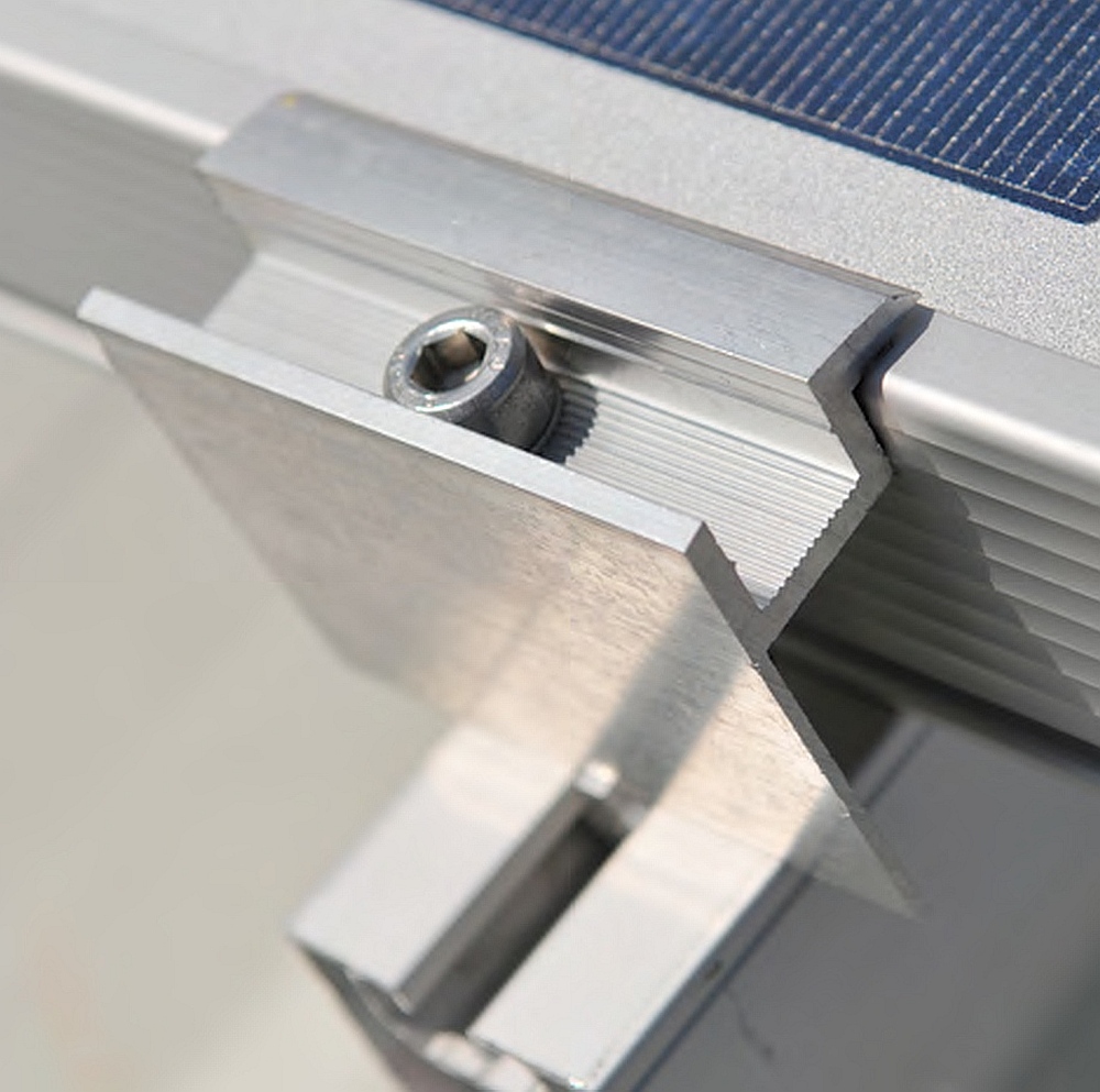 - Erdung durch Kerbsteg auf der Klemmbacke: Dieser durchbricht beim Anziehen die Eloxialschicht des Solarmodulrahmens und erdet den Rahmen Anwendung: Zur Befestigung von gerahmten Photovoltaikmodulen.
