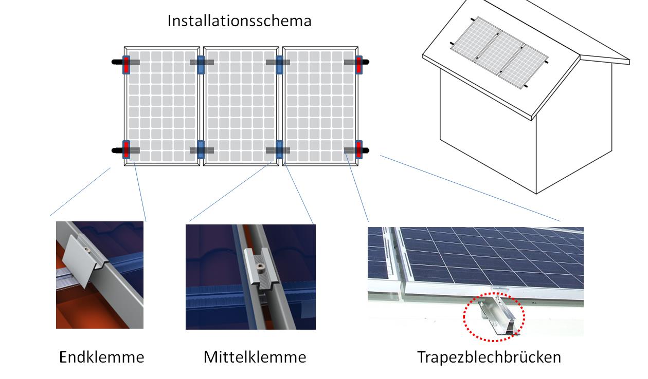 - 3 Module nebeneinander: 4 x Endklemmen (bei uns erhältlich)+ 4 x Mittelklemmen Befestigungsset