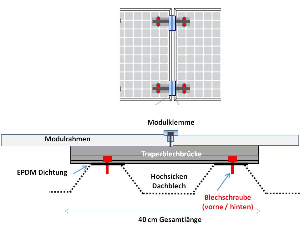 Stellen Sie für die Installation sicher, dass der Untergrund ausreichend tragfähig ist. Beachten Sie, wenn Sie parallel zur Trapezblechsicke montieren, dass eine Linienlast auf die Hochsicke wirkt. Das Trapezblech sollte entsprechend ausreichend Dicke haben und Tragfähigkeit. Richten Sie sich gerne bei Fragen an uns.