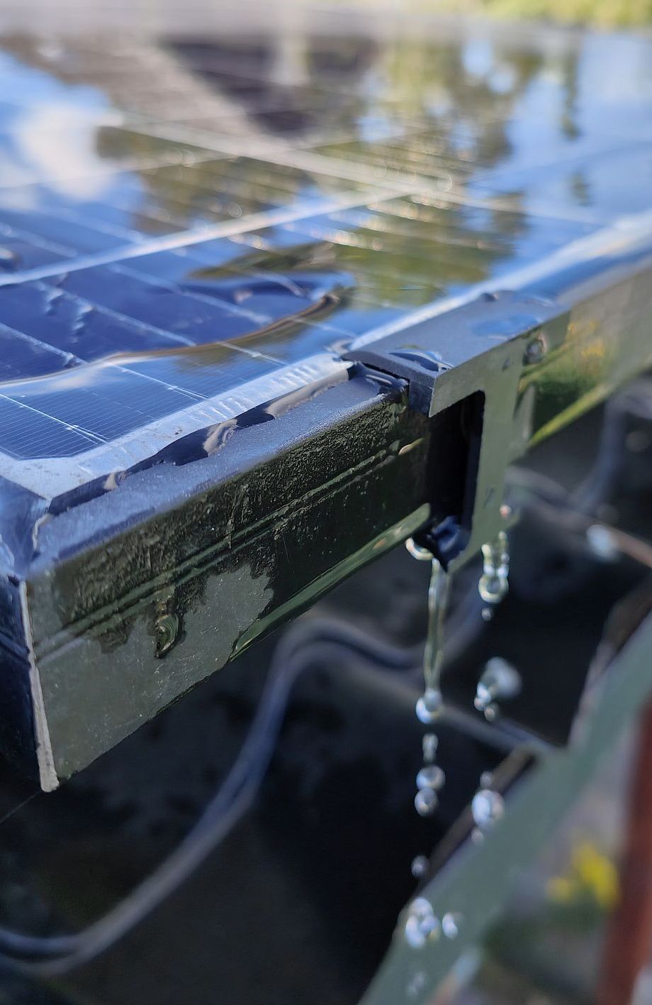 Insbesondere bei Solarinstallation mit flacher Neigung wie 10° oder 20° bleiben nach Regen am unteren Modulrand oder in Ecken stehende Wasserpfützen zurück. Der Modulrahmen hindert das Wasser am abfliessen. Das stehende Wasser führt zu hartnäckiger Verschmutzung auf dem Solarmodulglas was Mindererträgen zur Folge hat.