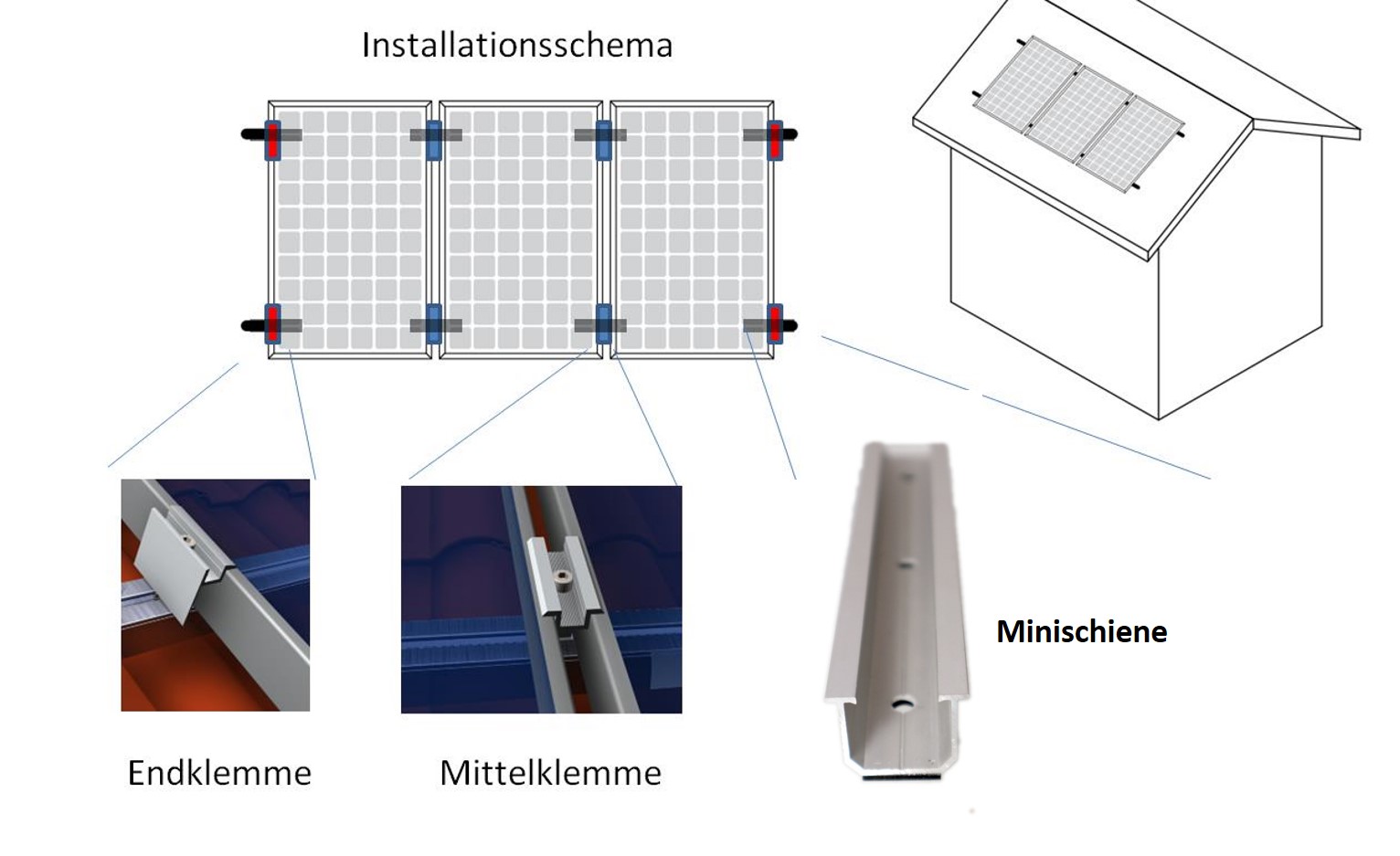 - 2 Module nebeneinander: 4 x Endklemmen + 2 x Mittelklemmen Befestigungsset (bei uns erhältlich)